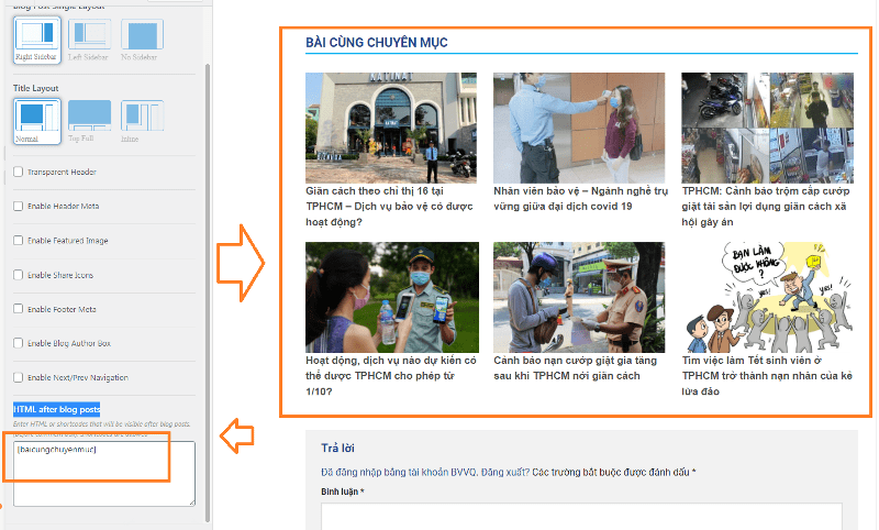Tìm HTML after blog posts bỏ đoạn shortcode [baicungchuyenmuc] vào là xong