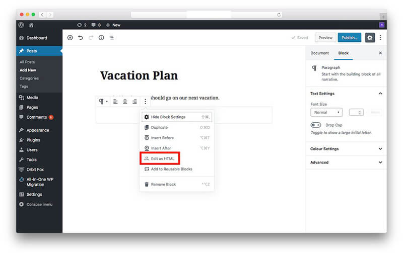 - Đổi trình biên tập bài viết sang “Edit as HTML”: Bạn vào website WordPress của mình, tạo bài viết mới hoặc sửa bài viết cũ. Click dấu ba chấm dọc và chọn “Edit as HTML” trong ô bài viết.