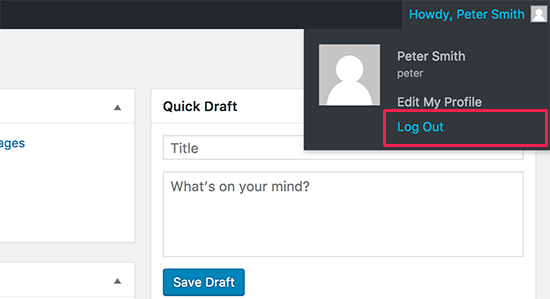 Thông thường, bạn có thể đăng xuất khỏi trang WordPress bằng cách nhấp vào liên kết đăng xuất. Liên kết này nằm dưới ảnh profile của bạn ở trên cùng bên phải thanh quản trị WordPress.