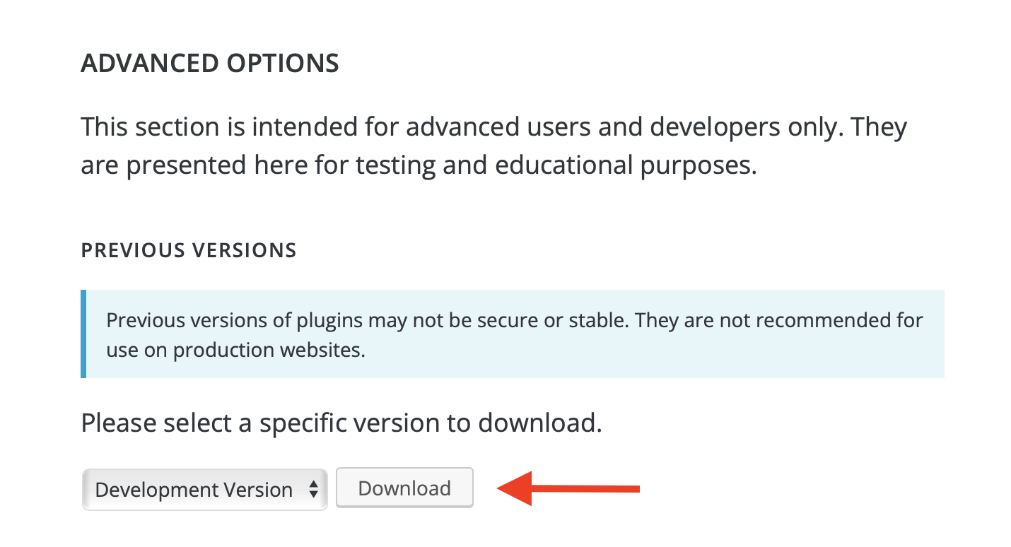 Sau đó cuộn xuống cuối trang, chọn một phiên bản cụ thể bạn muốn hạ cấp và nhấp vào nút Download.Tải xuống phiên bản plugin