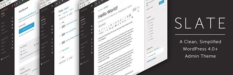Slate là một giao diện trang quản trị đơn giản và sạch sẽ cho WordPress. Nó sử dụng một thanh quản trị màu nâu sẫm với màu xanh lam cho các liên kết, nút và menu. Slate tập trung vào việc cải thiện trải nghiệm viết nội dung bằng cách cung cấp giao diện người dùng quản trị tinh gọn.
