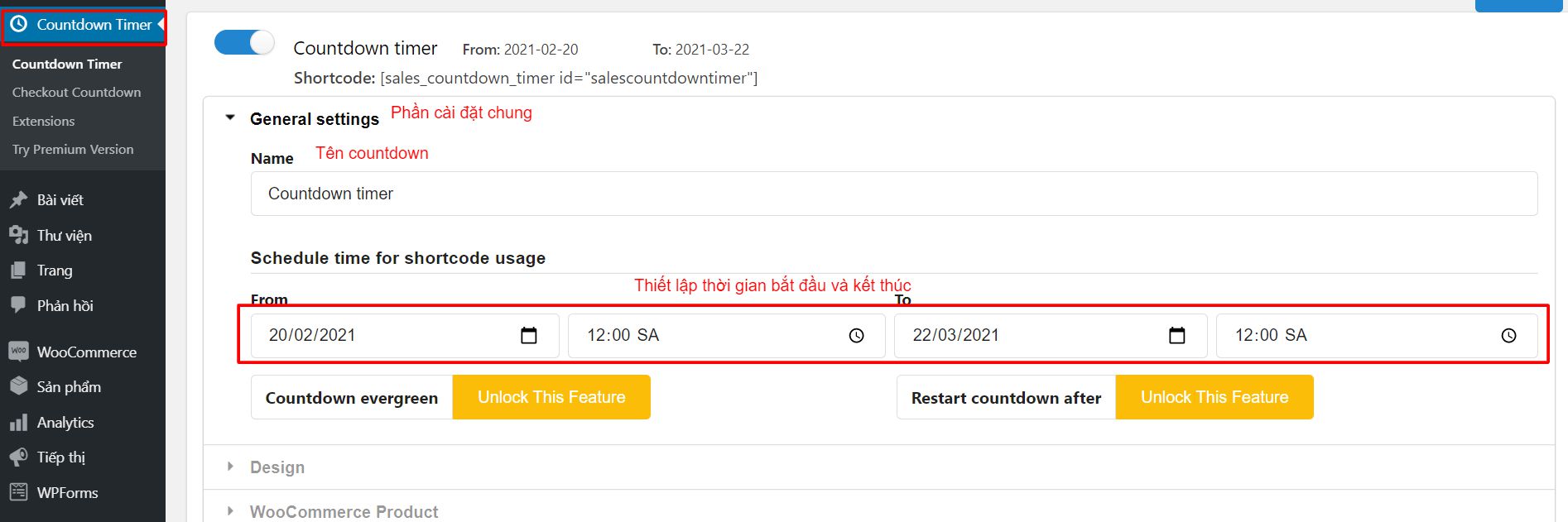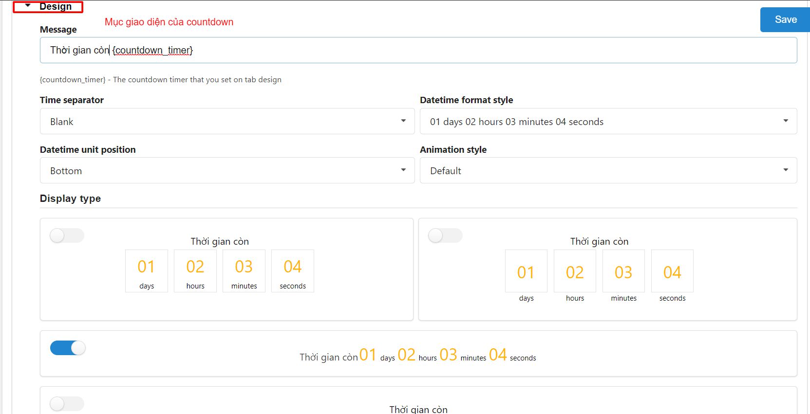 Phần design thiết kế: sẽ là phần cài đặt màu sắc, kiểu dáng cho thanh countdown,
