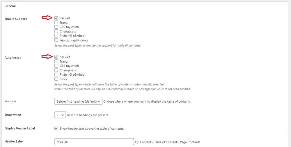 - Enable Support: chọn loại nội dung sẽ được tạo Table of Contents.
