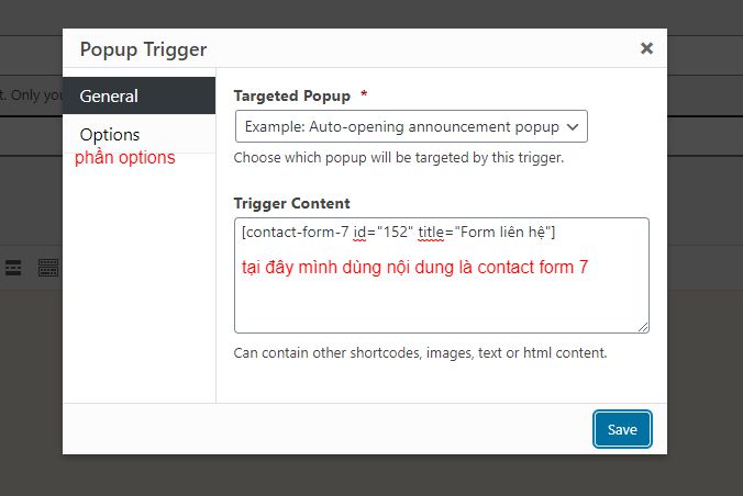 tại mục popup trigger hãy nhập phần nội dung, ở đấy mình dùng tạm contact form 7 để làm form đăng kí popup