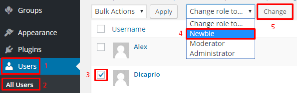 Để gán vai trò mới cho người dùng, hãy điều hướng đến Trang tổng quan WordPress → Users → All users và làm theo hướng dẫn bên dưới.