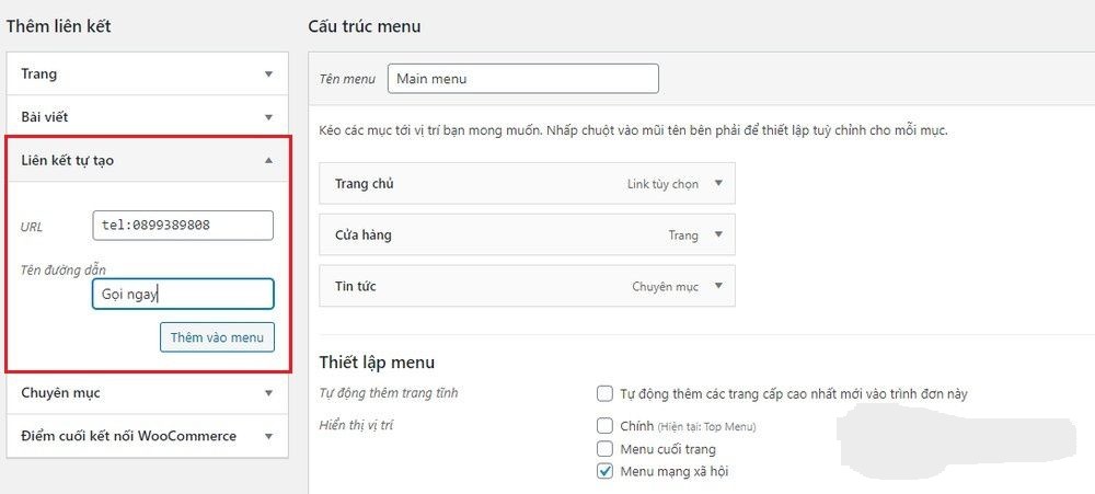 Nếu bạn muốn nút gọi ngay nằm cố định và xuất hiện ở mọi trang thì có thể thêm nó vào menu. Bằng cách thêm một Liên kết tự tạo vào menu với tên và cấu trúc đường dẫn như trên là được.